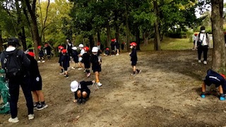 久宝寺緑地に到着し、どんぐり拾いが始まっています。