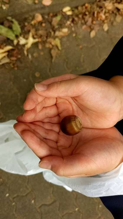 たくさん拾ったり、どちらのドングリのほうがツルツルしているか比べあったりして、みんなで楽んでいます。