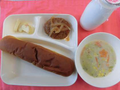 煮込みハンバーグ、豆乳コーンスープ、焼きじゃが