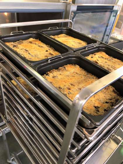 今日の献立は、黒糖パン・なすのミートグラタン・鶏肉と野菜のスープ・黄桃かんづめ・牛乳です。