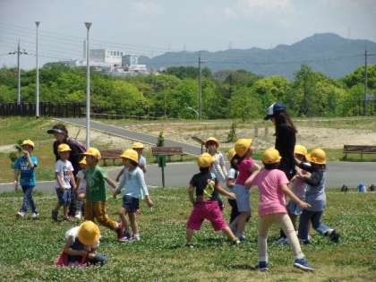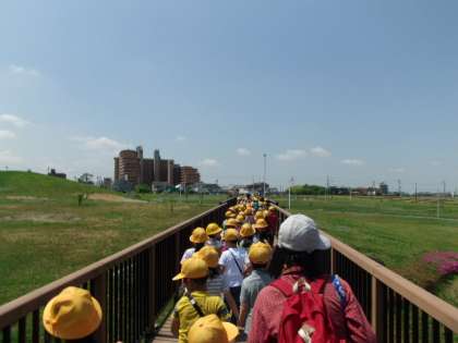 立夏を過ぎ、熱中症が心配になるほどの晴天のもと、1年生が寝屋川公園へ行きました。入学して初めての校外活動です。