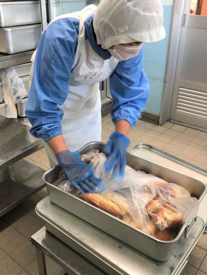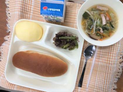 今日の献立は、黒糖パン・牛肉のオイスターソース焼き・中華スープ・りんご・牛乳です。