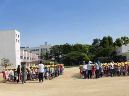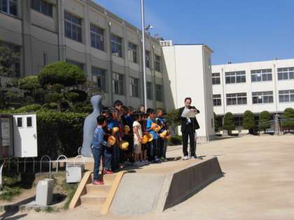 4月から清掃を手伝ってくれた5年生のお兄さん・お姉さんに、1年生から「ありがとうございました!」とお礼を言いました。