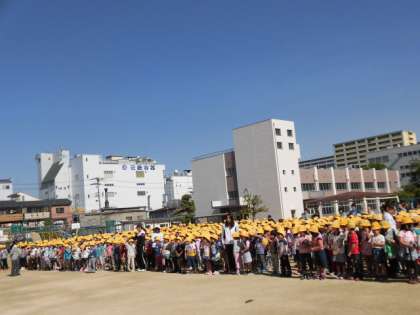 今年度は月曜日の朝の雨が多く、初めて運動場での朝会となりました。