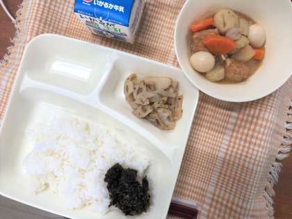 今日の献立は、ごはん・関東煮・れんこんの梅風味焼き・のりのつくだ煮・牛乳です。