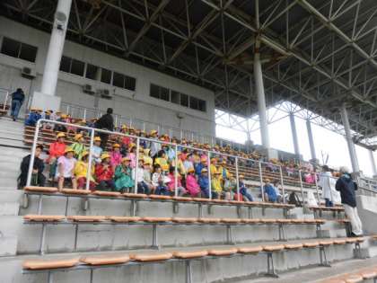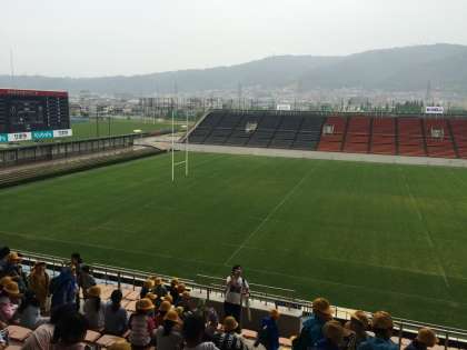 晴れていたら入れなかった、花園ラクビー場のスタンドで、お弁当を食べさせていただきました。「わあ〜きれい!」「広い!!」と、初めて見るラグビー場に、子どもたちは感激していました。