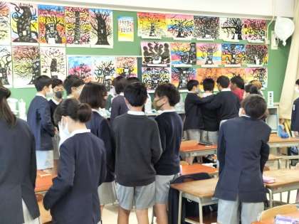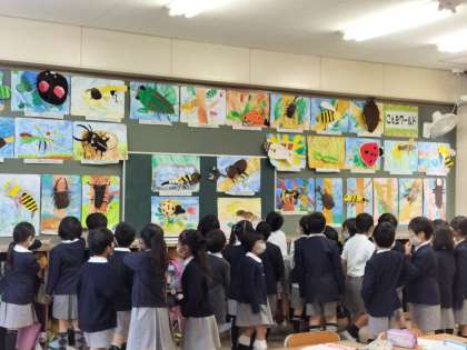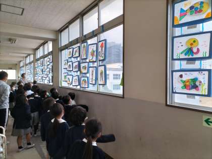 各学年、1クラスずつ時間を決めて順番に他の学年の友だちの作品を鑑賞しています。1年生から6年生まで、みんな熱心に見て回っています。
