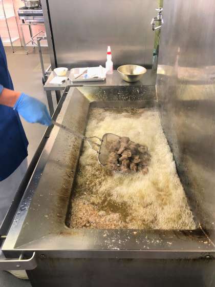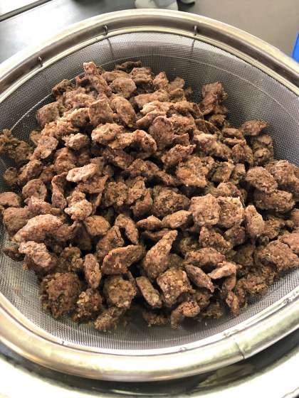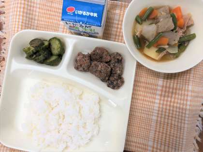 今日の献立は、ごはん・くじらのたつたあげ・豚肉とじゃがいもの煮もの・きゅうりの赤じそあえ・牛乳です。