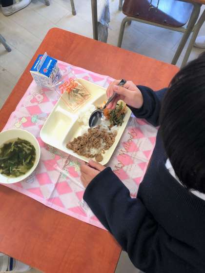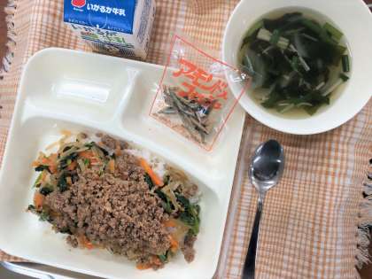 今日の献立は、ビビンバ・わかめスープ・アーモンドフィッシュ・牛乳です。