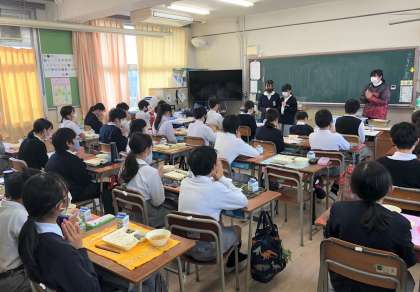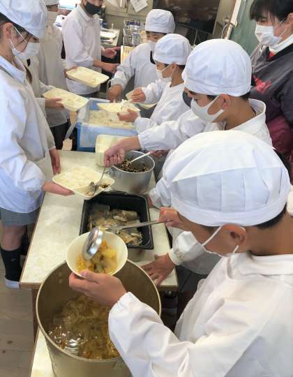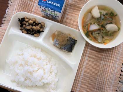 今日の献立は、ごはん・さごしのおろしじょうゆかけ・さといものすまし汁・大豆の煮もの・牛乳です。