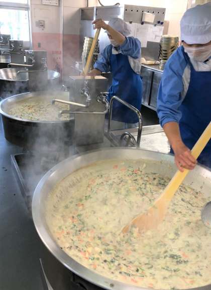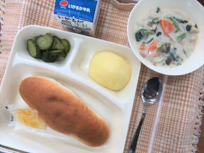 今日の献立は、コッペパン・マーマレード・きのこのクリームシチュー・きゅうりのバジル風味サラダ・りんご・牛乳です。