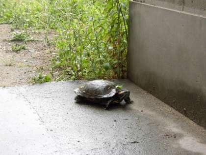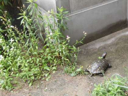 こんなに遠くまで散歩に出ても、亀吉は必ず、亀池に戻ってきます。