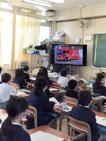 消防署で働く人たちについての学習です。今年は見学に行くことができないので、残念ですが、消防車にもいろいろな種類があることも学習しました。