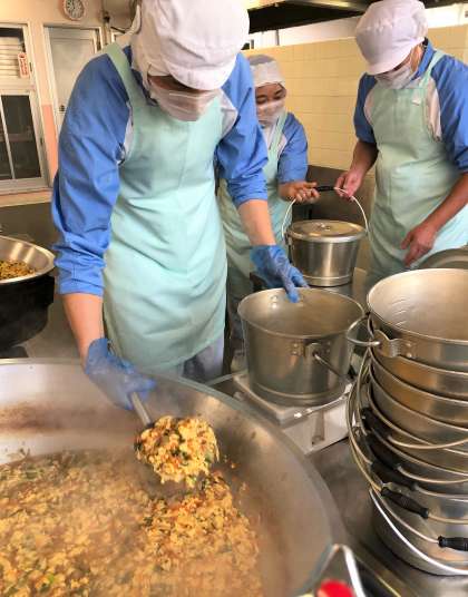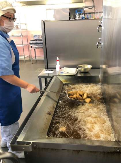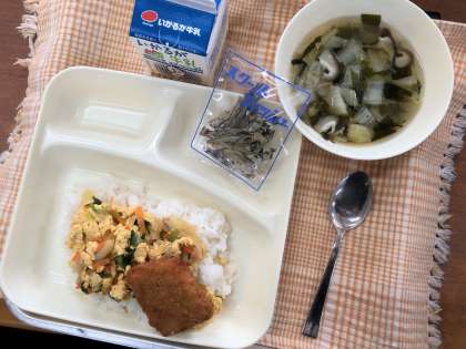今日の献立は、カツ丼・すまし汁・ミニフィッシュ・牛乳です。