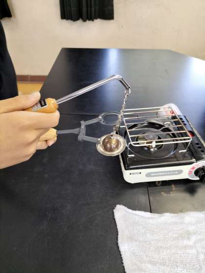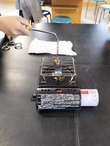 「ものの温度と体積」の単元で、金属を温めると体積が増えるかどうかを確かめる実験をしています。