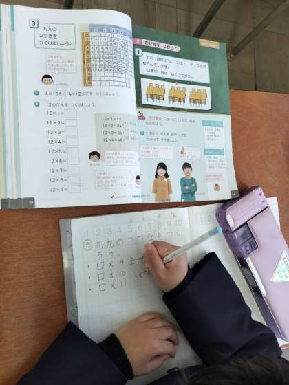 九九のつづきをつくります。10のだん以上はありませんが、今まで学習したことをもとに考えていきます。