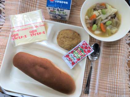 今日の献立は、黒糖パン・とうふハンバーグ・カリフラワーのスープ煮・スライスチーズ・牛乳です。