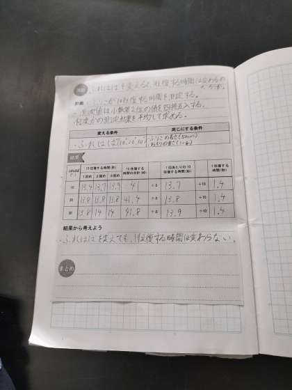 ふりこが一往復する時間について、いろいろと条件を変えて実験しました。班のメンバーで協力していました。結果についてもしっかりとまとめていました。