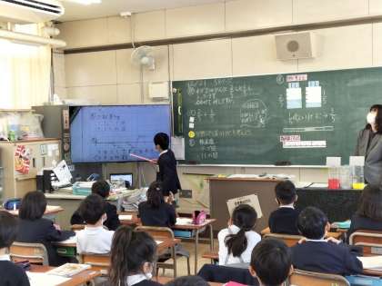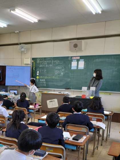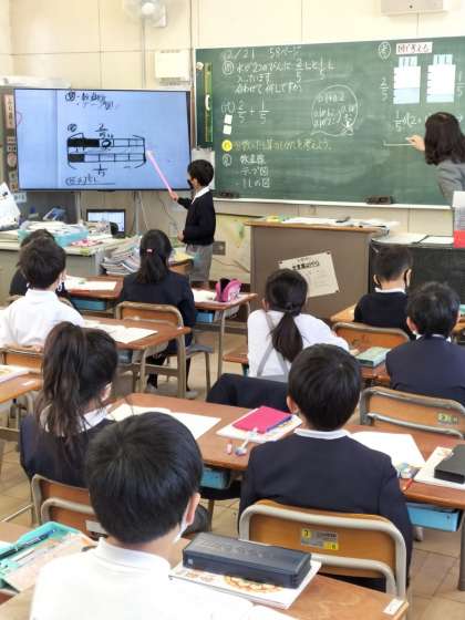 分数のたし算の答えをいろいろな考え方で求めました。友だちの前でも求め方をしっかりと発表していました。