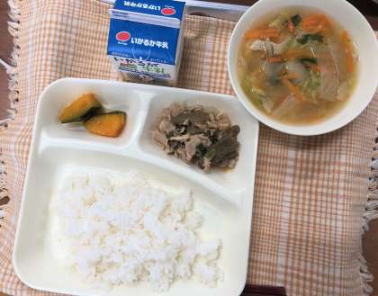 今日の献立は、ごはん・豚肉と干しずいきのみそ煮・うすくず汁・焼きかぼちゃの甘みつかけ・牛乳です。