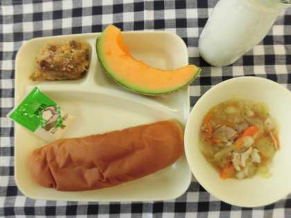 カレードリア、キャベツのスープ、クインシーメロン、大型コッペパン、マーガリン、牛乳  でした。