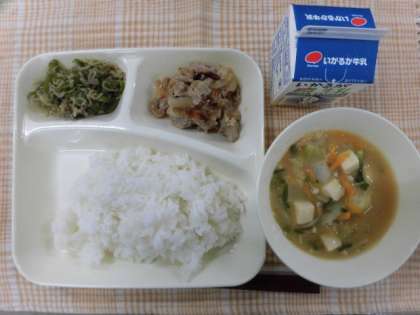 今日の献立は、ごはん・豚肉のしょうが焼き・みそ汁・じゃこピーマン・牛乳です。