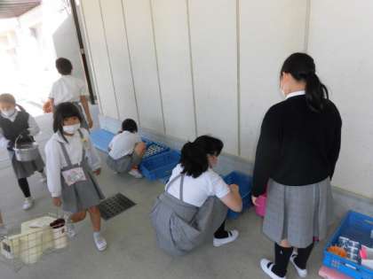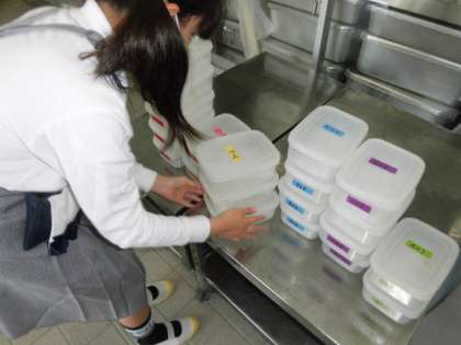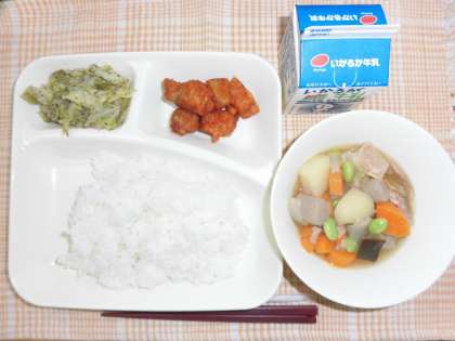 今日の献立は、ごはん・まぐろのオーロラ煮・豚肉と野菜の煮もの・キャベツの赤じそあえ・牛乳です。