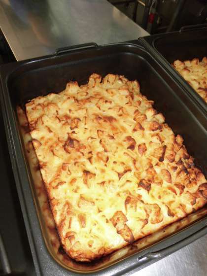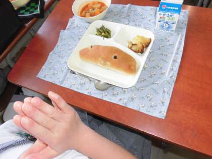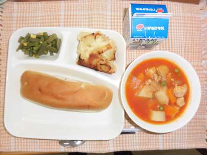 今日の献立は、レーズンパン・ケチャップ煮・さんどまめとコーンのソテー・りんごのクラフティ・牛乳です。