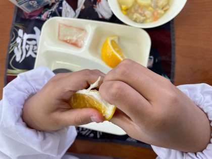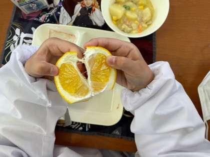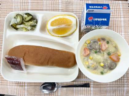今日の献立は、コッペパン・いちごジャム・コーンクリームシチュー・キャベツときゅうりのサラダ・かわちばんかん・牛乳です。