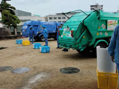 環境事業局の方に来ていただき、ゴミの収集についてのお話を聞きました。あいにくのお天気でしたが、熱心にお話を聞いていました。