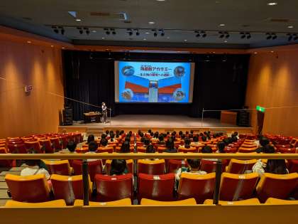 まずは、1組と2組がアカデミーでイルカのお話を聞いています。