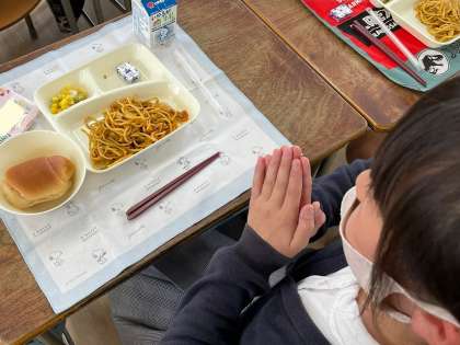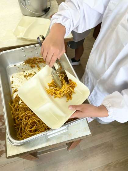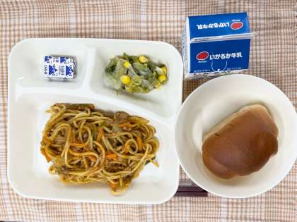 今日の献立は、1/2黒糖パン・カレースパゲッティ・レタスとコーンのサラダ・固形