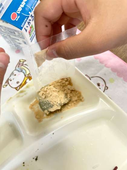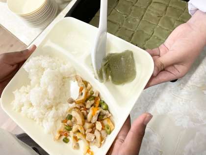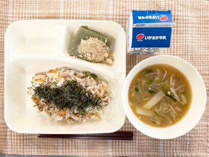 今日の献立は、かやくごはん・じゃがいものみそ汁・まっ茶ういろう・牛乳です。