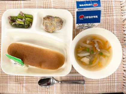 今日の献立は、コッペパン・ソフトマーガリン・かつおのガーリックマヨネーズ焼き・スープ・グリーンアスパラガスとベーコンのソテー・牛乳です。