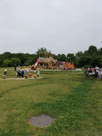 お昼ご飯のあとは、広場で遊んでいます。他校の友だちもたくさんいますが、仲よく気をつけて遊んでいます。