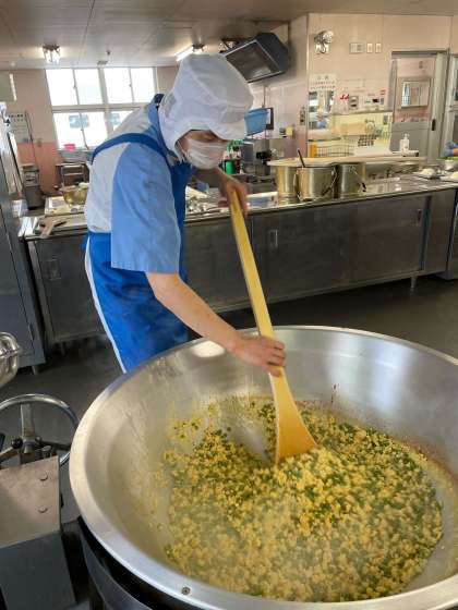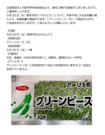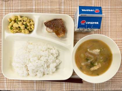今日の献立は、ごはん・あかうおのしょうゆだれかけ・みそ汁・えんどうの卵とじ・牛乳です。