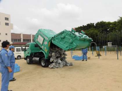 運動場に入ってきたパッカー車に、みんな興味津々です。