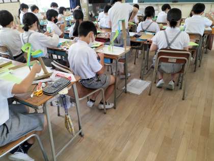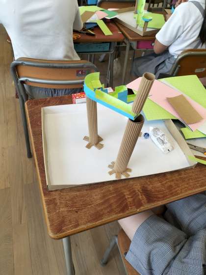 ビー玉の転がる道を、厚紙などで工夫して作っています。出来上がりが楽しみです。