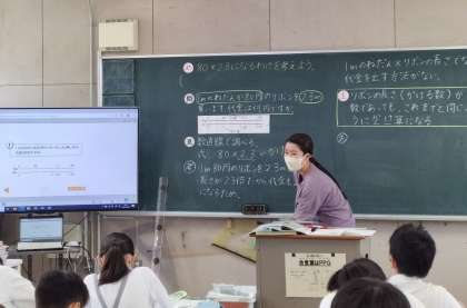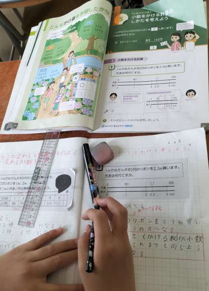小数のかけ算の学習をしています。整数のかけ算の仕方をもとに考えています。