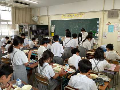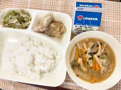 今日の献立は、ごはん・鶏肉のおろしじょうゆかけ・みそ汁・野菜いため・牛乳です。