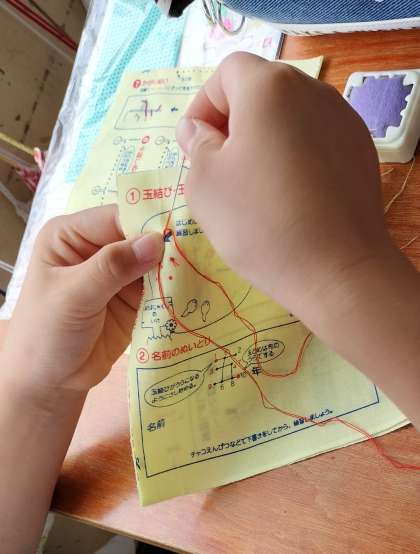 玉結び、玉どめをしています。なかなかうまくいきませんが、がんばっています。