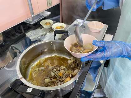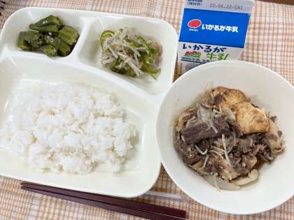 今日の献立は、ごはん・すきやき煮・オクラのかつお梅風味・もやしとピーマンのごまいため・牛乳です。