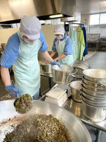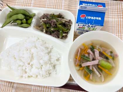 今日の献立は、ごはん・チンジャオニューロウスー・ハムと野菜の中華スープ・えだまめ・牛乳です。