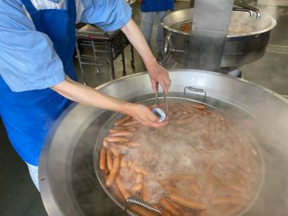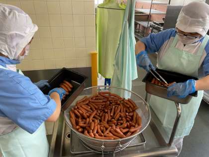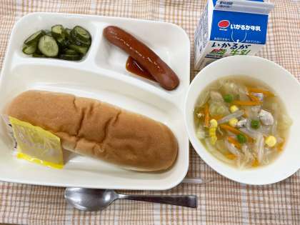 今日の献立は、コッペパン・アプリコットジャム・ウインナーのケチャップソース・スープ・きゅうりのサラダ・牛乳です。