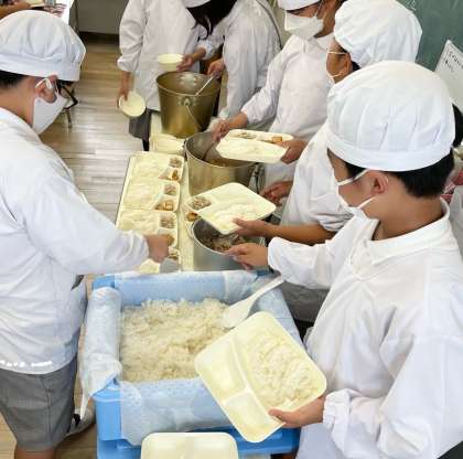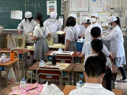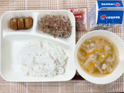 今日の献立は、ごはん・豚肉ともやしのいためもの・すまし汁・あつあげのしょうがじょうゆかけ・牛乳です。