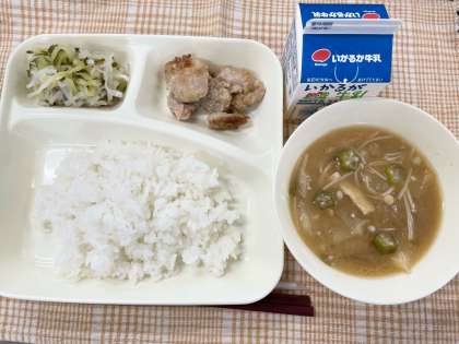 今日の献立は、ごはん・鶏肉のしょうゆマヨネーズ焼き・とうがんのみそ汁・切しだいこんのゆずの香あえ・牛乳です。