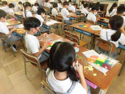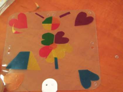 透明なうちわにカラーセロハンで飾りをつけて うちわを作ります。