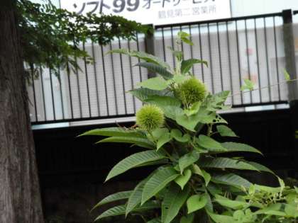 まだまだ低くて細い木ですが、イガが青々として、なかなか立派な実です。