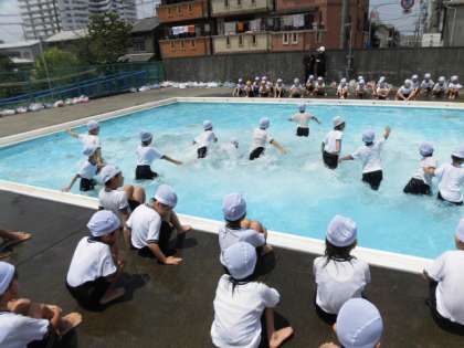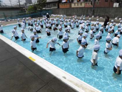 1、2年生は、水着と着衣との水中での感覚の違いを知り、水中での危険性を認識することをねらいとしています。体操服で入ったプール、どんな感じだったかな?