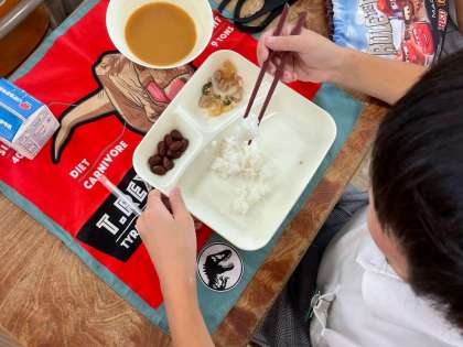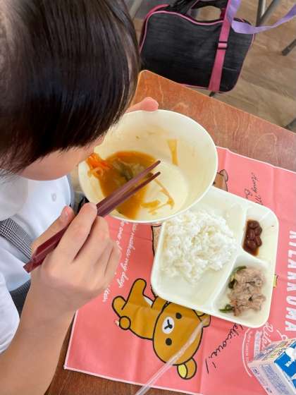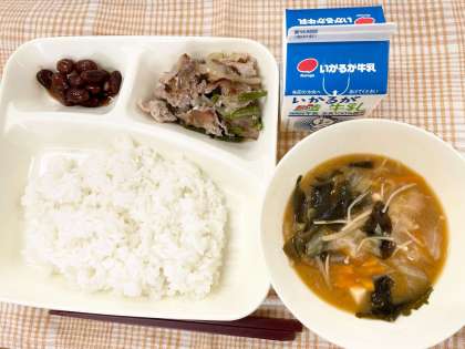 今日の献立は、ごはん・豚肉の甘辛焼き・みそ汁・金時豆の煮もの・牛乳です。